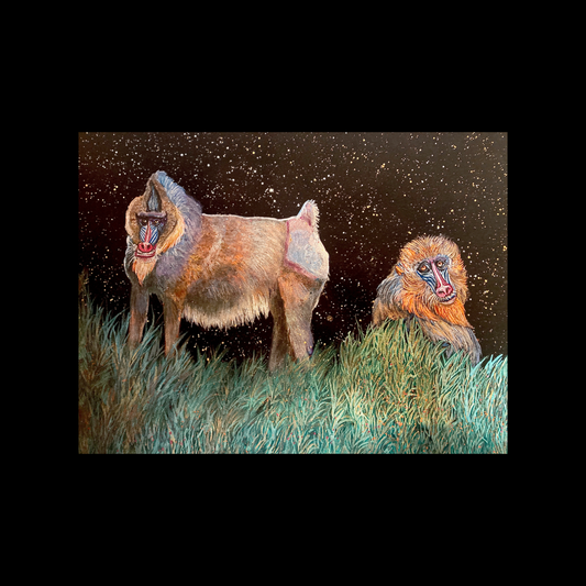 Mandrills and Stars Pearlescent Watercolor Painting 9x12